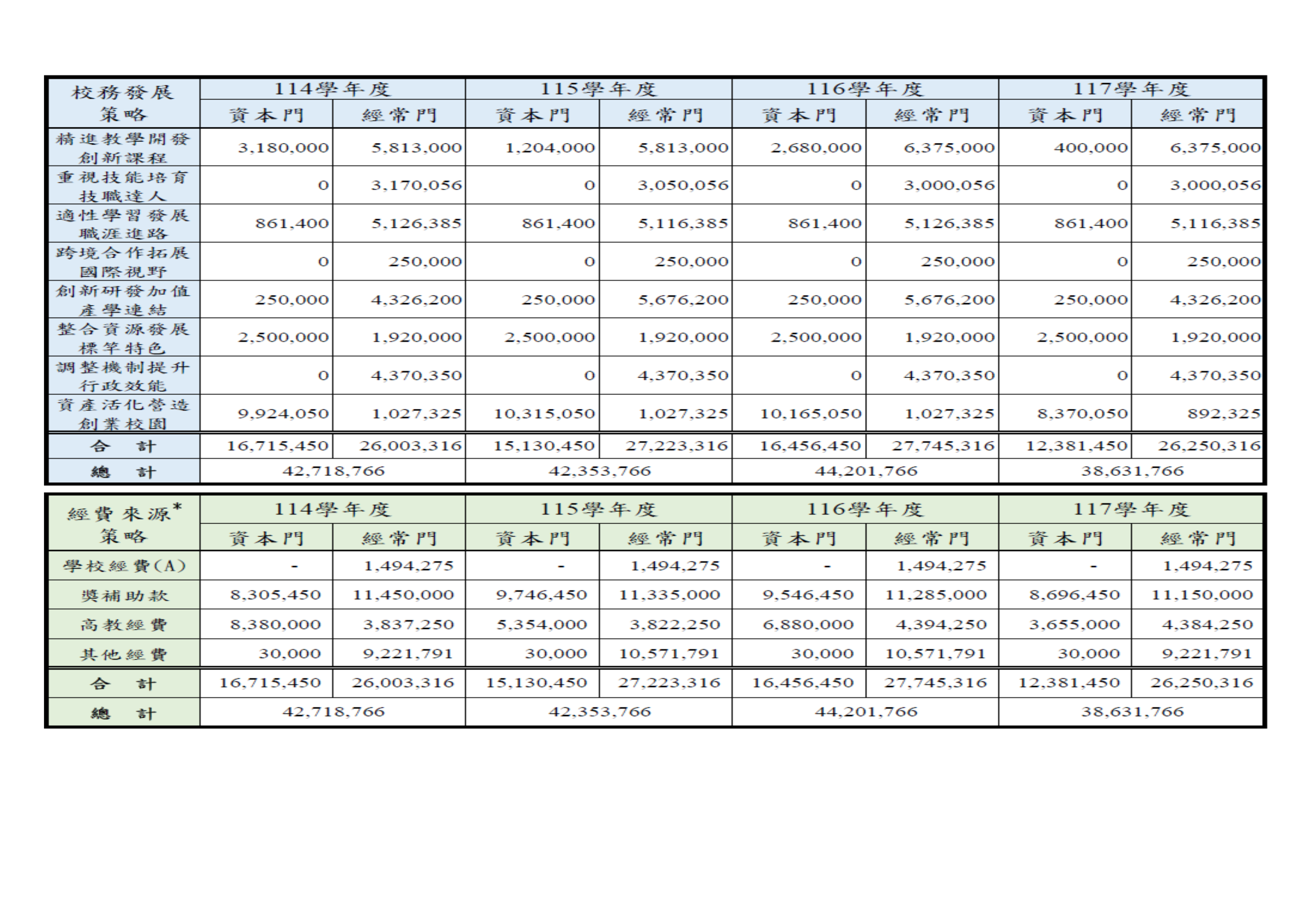 預算的編製將各項獎補助經費均納入學校預算,同時配合校務發展計畫的執行進度,再依各年度計畫執行進度修正編列,每學年組成預算委員會進行年度預算的審議等相關事宜。